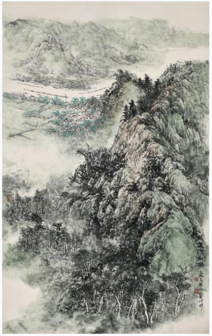 作品簡介:《運河和鳴》,尺寸1.6米高1米寬。以傳統山水筆法,勾勒山河壯景。悠悠蜿蜒的運河,宛如民建80載波瀾壯闊的發展長河。在黨的引領下,民建先賢們積極投身運河航運相關事業,有的參與規劃,殫精竭慮優化航道布局;有的投身建設,揮灑汗水助力工程推進;有的建言獻策,為航運發展謀良策。此畫致敬其貢獻,激蕩起奮進新程的磅礴力量。