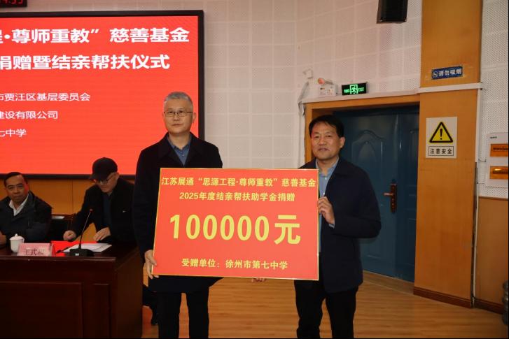 11月19日下午,江蘇展通“思源工程·尊師重教”慈善基金2025年度捐贈暨結親幫扶儀式在徐州市第七中學報告廳舉行。本次活動由民建徐州市賈汪區基層委員會、會員企業江蘇展通建設有限公司與徐州市第七中學聯合舉辦。民建徐州市賈汪區基層委主委、賈汪區住房和城鄉建設局局長付洋,賈汪區基層委副主委、江蘇展通建設有限公司董事長張友坤,徐州市第七中學校長吳強參加活動,徐州市第七中學工會主席王武和主持活動。